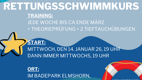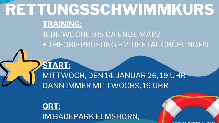 Trainingsbeginn ist am 14. Januar und dann immer mittwochs um 19 Uhr. Dazu kommen noch 3 Termine für die Theorieprüfung und Tieftauchübungen.